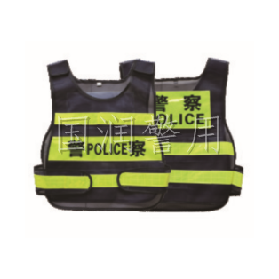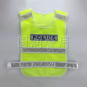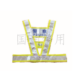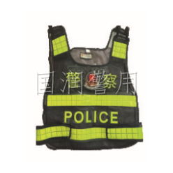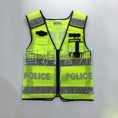 款式:套头式前后片反光背心,前片有隐蔽式拉链口袋,具有双对讲机袢、胸徽、警号搭扣,前后片共六道反光带及前胸蓝色英文“POLICE”和后背“警察”文字一次成型印刷片。